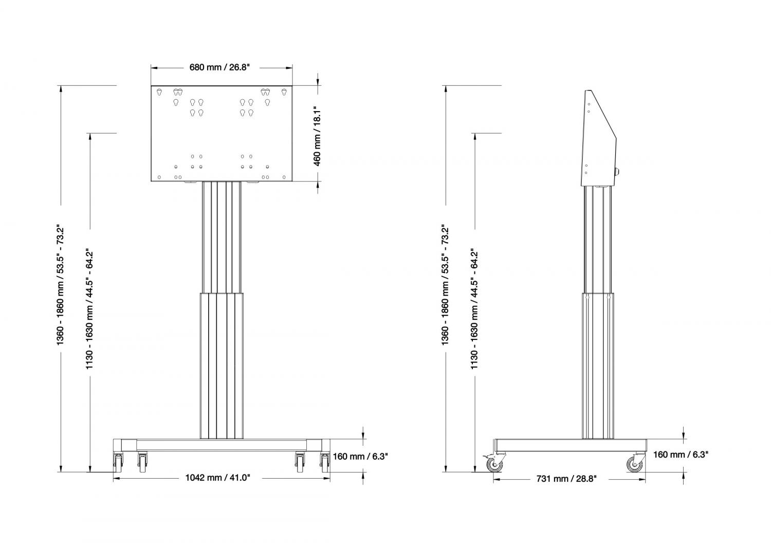 Elektrisch in hoogte verstelbare tv-trolley standaard; mobiele monitorstandaard geschikt voor gebruik met alle beeldschermen van 42"-70" schermdiagonaal. De tv-trolley SCETAVBOX staat bekend om zijn stabiliteit en veelzijdigheid. De mobiele monitorstandaard is ontworpen voor intensief dagelijks gebruik en om schermen tot 70" schermdiagonaal of 120 kg stevig vast te houden. Het SCETAVBOX mobiele montagesysteem is uitgerust met een centrale mastkolom en een naaf van 50 cm. Het product wordt gedemonteerd geleverd in drie pakketten Alle Verpakkingseenheden zijn geschikt voor pakketdiensten.
