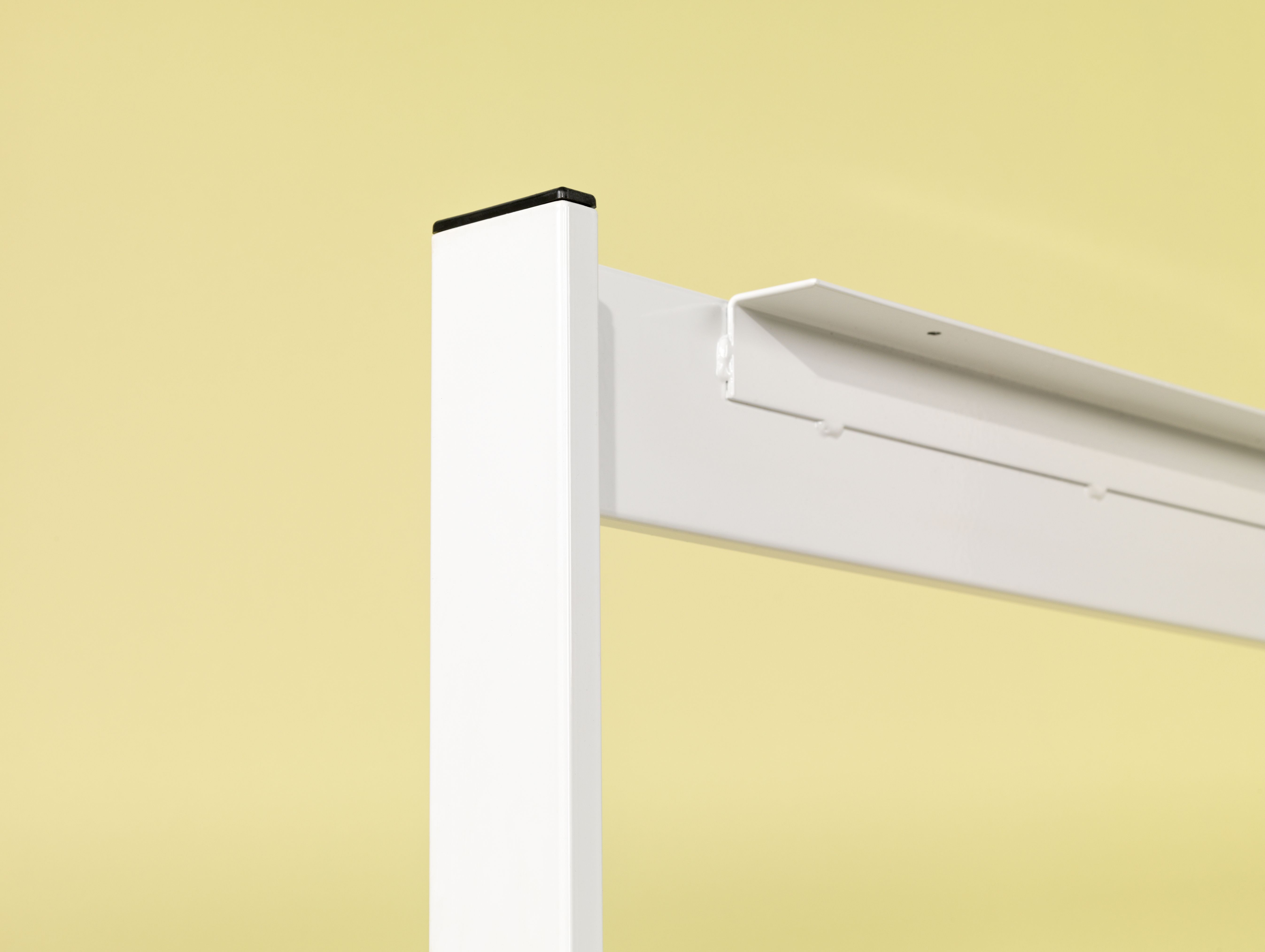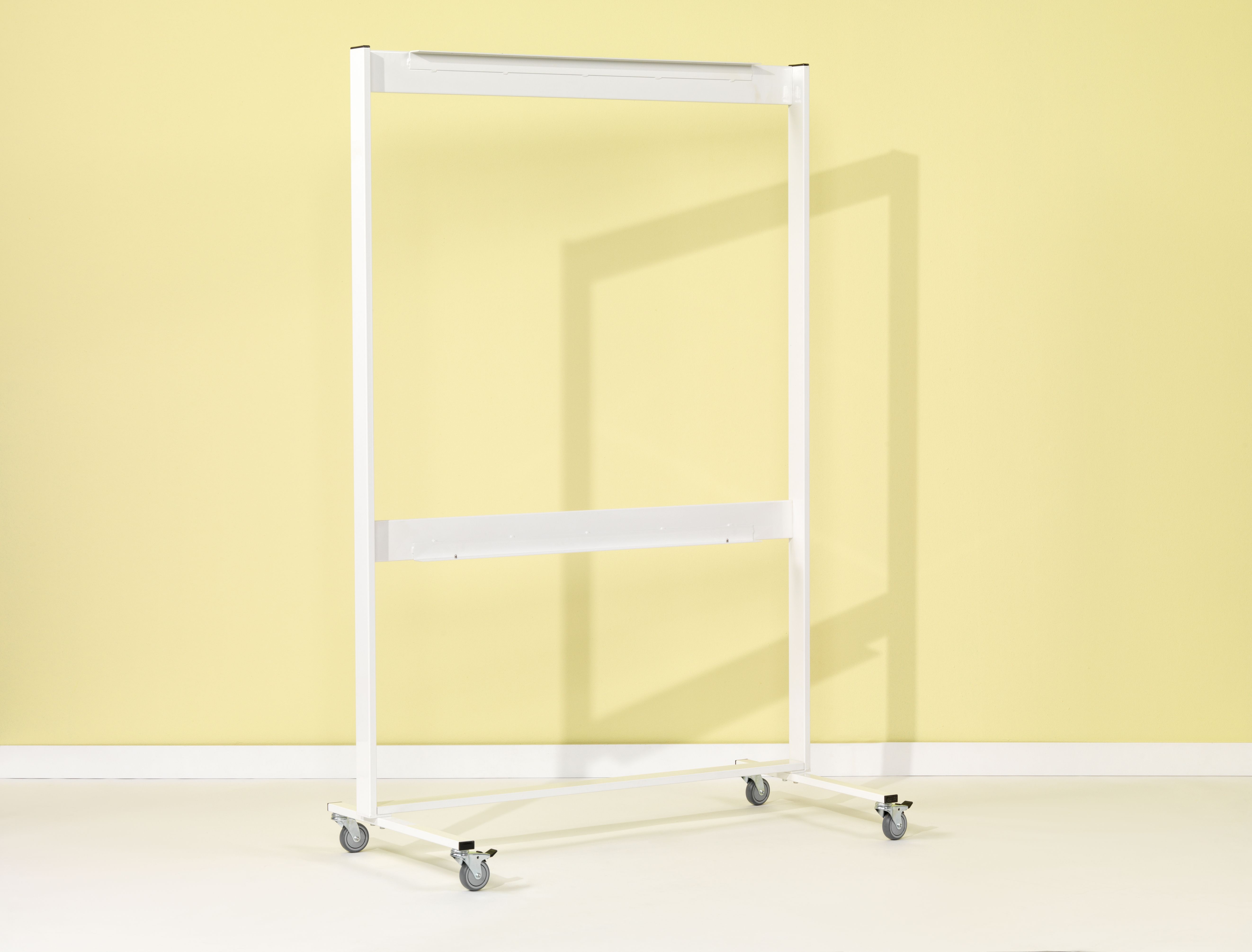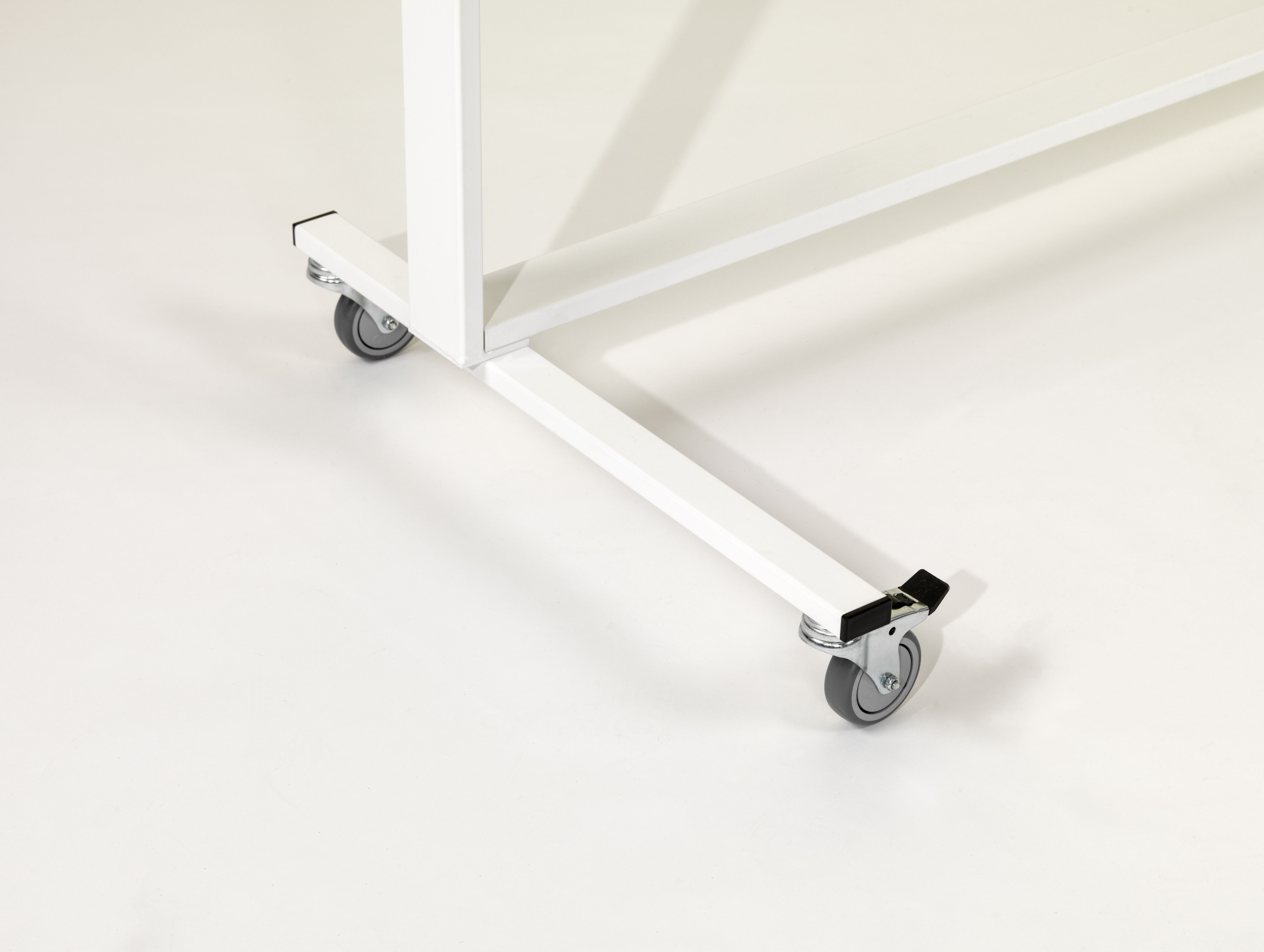 Wit stalen verrijdbaar onderstel voor kabinetkast met wit aluminium profiel. Voorzien van 4 wielen (2 met rem).