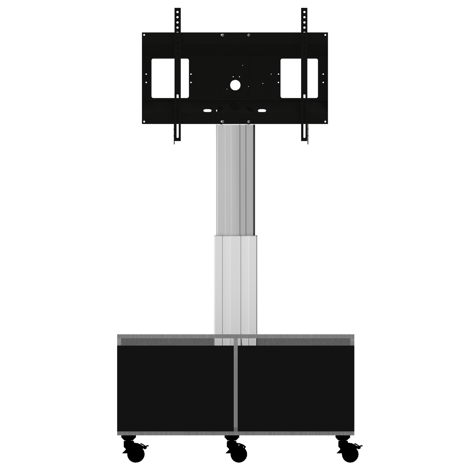 Elektrisch in hoogte verstelbare TV kast. Tv-meubel met twee draaideuren aan de voorzijde en twee verstelbare planken, een rechts en een links. Twee kabeluitgangen zorgen voor het eenvoudigste kabelbeheer. Het tv-lowboard wordt geleverd met 6 trompetvoeten en 6 met rubber beklede, lichtlopende wielen, waarvan er twee kunnen worden vastgezet. Gebruik de trompetvoeten als u uw displaystandaard voor een muur wilt plaatsen (geen wandaansluiting nodig) of vrijstaand in de kamer. Of kies voor maximale flexibiliteit en gebruik de 6 soepel lopende rubberen wielen. De tv-kast is uitgevoerd in geborsteld aluminium, inclusief twee vleugeldeuren in zwart. De SCETASBN wordt geleverd met een elektrisch in hoogte verstelbare mastkolom met een slag van 50 cm. De monitorstandaard is geschikt voor schermen van 42 tot 86 inch, met VESA 200 x 200 tot 800 x 600 en tot maximaal 136 kg. Het systeem wordt gedemonteerd geleverd in een verpakkingseenheid.
