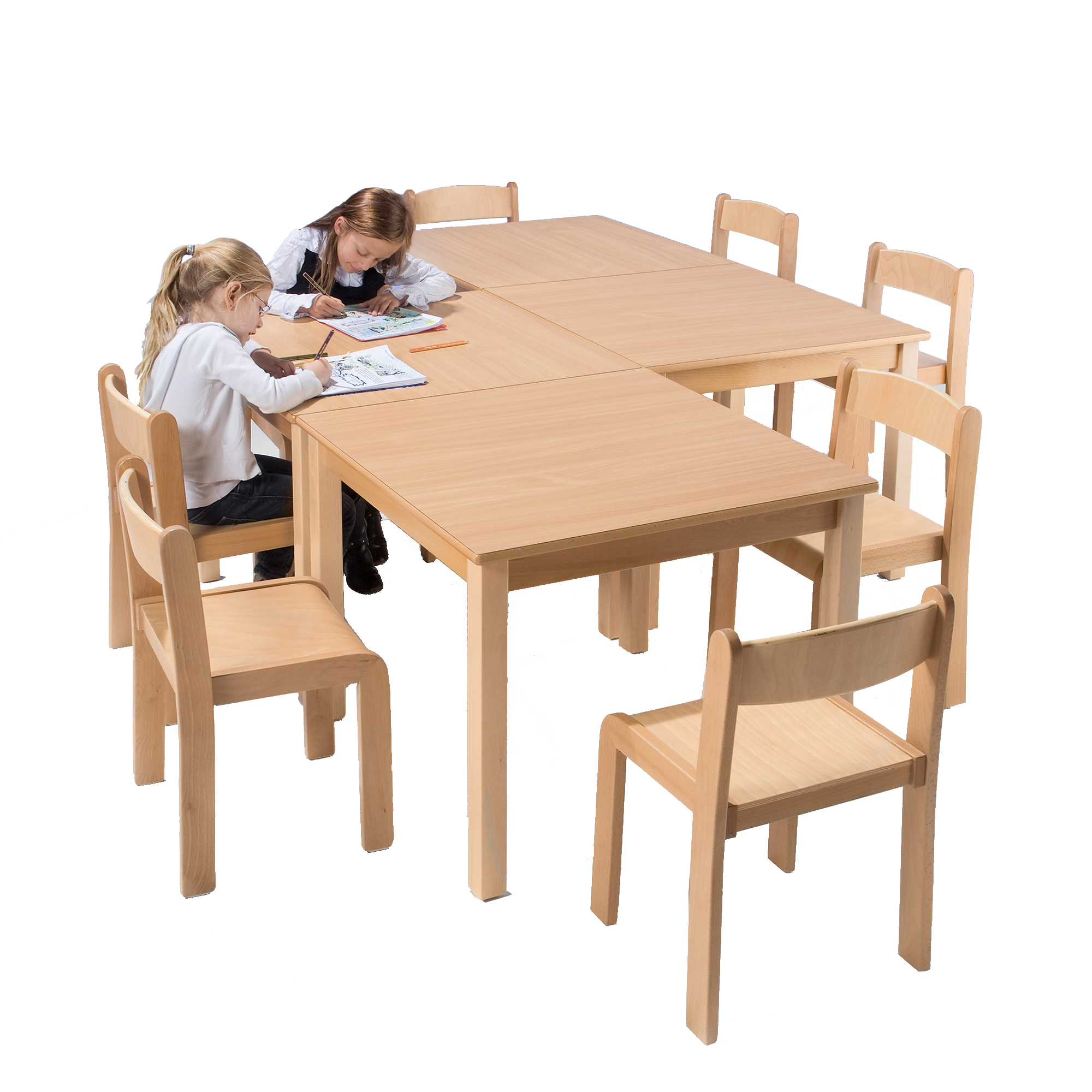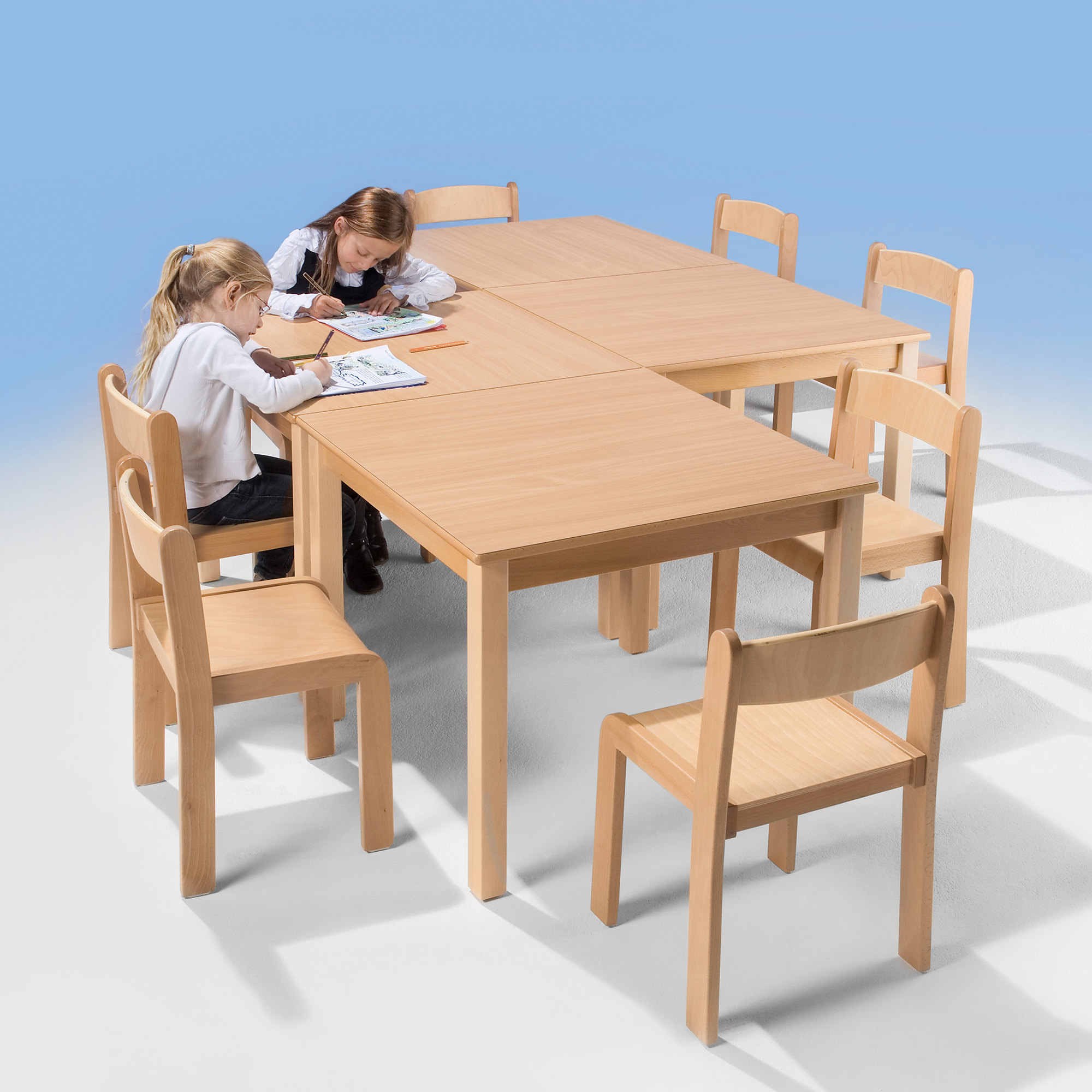 De poten en het frame van deze tafels zijn gemaakt van massief beukenhout. De tafelbladen zijn ca. 19 mm dik en aan beide zijden bekleed met laminaat, de rand bestaat uit een afgeronde massief beukenhouten rand. De zeer resistente en slijtvaste coating is ideaal voor gebruik in kleuterscholen. De tafelpoten worden met dubbele verbindingsbouten stevig in de hoek van het onderstel getrokken. Samen met de stevig verlijmde meenemers (uit vakwerkconstructie) ontstaat een veilige en zeer stabiele hoekverbinding. De verwisselbare tafelpoten hebben nog een voordeel: de tafel kan met je meegroeien. Bestel eenvoudig hogere tafelpoten. Beschikbare opties Vilten glijders "F" Gefreesde tafelonderstellen "A" 2 wielen in een set "TFR"