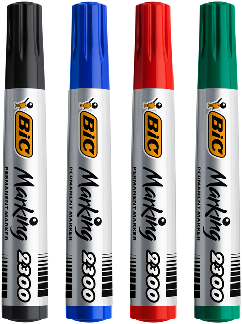 * Of u nu thuis bent of op kantoor, er is altijd wel een taak waarbij u een permanent marker nodig hebt. * De BIC Marking 2300 staat voor u klaar. * Hij schrijft op meerdere oppervlakken en zorgt ervoor dat alles gelabeld en georganiseerd raakt. * Zorg voor opvallende markeringen op alle oppervlakken; van papier en karton tot plastic en metaal. * De stevige schuine punt is ontworpen om letters en lijnen te creëren met verschillende groottes en breedtes. * Daarnaast maakt schrijven met deze vrijwel geurloze permanent markers elke taak leuk. * Speciale inkt die snel droogt en niet lichtgevoelig is, zodat uw markering blijft staan waar hij is. * Kan meer dan een km schrijven en droogt niet uit als er de dop eraf gelaten wordt (tot één maand). * Deze permanent marker is trouw aan zijn naam en wordt gemaakt door middel van een milieuvriendelijk proces in de BIC-fabrieken in Europa. BIC-kwaliteit, tot uw dienst.