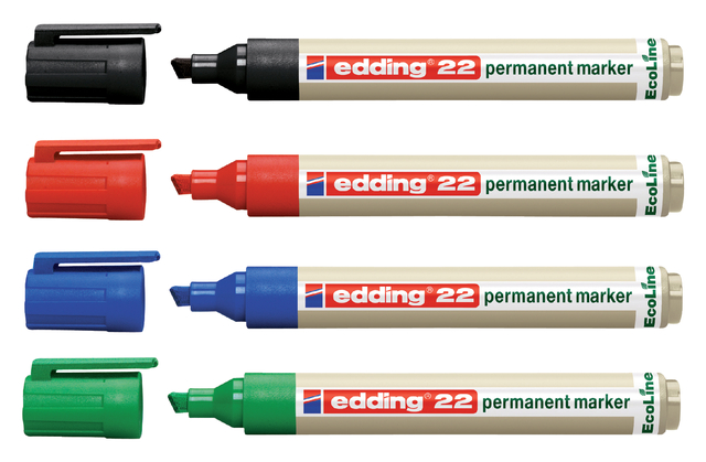 * Als er iets moet worden beschreven, gemarkeerd of duidelijk geaccentueerd, is de edding 22 Ecoline permanent marker de juiste keuze. * De marker kan worden gebruikt voor duurzame markeringen op vrijwel alle oppervlakken; van foto's, kunststof en glas tot en met hout, steen, leer of metaal. * Het perfecte hulpmiddel voor dagelijks werk; mag in geen enkele keuken, werkkamer of werkplaats ontbreken. * De duurzame permanent marker heeft een robuuste, middelgrote beitelvormige punt en is ideaal voor zowel organisatorische taken als kunstzinnige creativiteit, bijvoorbeeld voor het labellen van dozen of kleerhangers voor meer structuur in huis, versieren van sneakers of bloempotten in vrolijke kleuren of het markeren van werkbladen in de eigen werkplaats. * De edding 22 laat een duurzaam stempel achter. * De kunststof delen bestaan voor minstens 90% uit gerecycled materiaal, waarvan 83% afkomstig is van post-consumer kunststoffen (bijvoorbeeld gebruikte yoghurtbekers). * Bovendien is de whiteboardmarker navulbaar met edding BTK 25 navulinkt. * Reservepunten zijn leverbaar. * Klimaatneutraal product conform ClimatePartner-ID 13742-1910-1001. * De permanent marker is gevuld met kleurintensieve en geurarme inkt; zorgt voor een fantastisch resultaat en hecht aan bijna elke ondergrond. * De dop kan op het uiteinde van de marker worden gezet.* Certificaat Green Brand 2021/2022.
