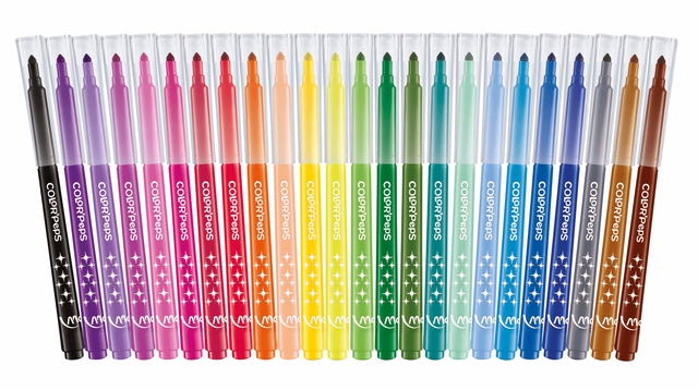Kleurviltstiften. * In handig kunststof etui met rits. * geblokte punt, voorkomt naar binnen schieten van de punt. * Ultra uitwasbaar uit de meeste textielsoorten. * Van de handen afwasbaar met water en zeep. * Vorm van de punt maakt zowel dun als dik kleuren mogelijk. * Lange levensduur: schrijflengte tot 300 meter. * Voorzien van een geventileerde dop. * Voldoet aan de actuele speelgoedregulering. * Kleurviltstiften * In kartonnen ophangdoos. * 24 heldere kleuren. * Geblokte punt, voorkomt naar binnen schieten van de punt. * Ultra uitwasbaar uit de meeste textielsoorten. * Van de handen afwasbaar met water en zeep. * Vorm van de punt maakt zowel dun als dik kleuren mogelijk. * Lange levensduur: schrijflengte tot 300 meter * Voorzien van een geventileerde dop. * Voldoet aan de actuele speelgoedregulering. * Verpakkingseenheid doos à 24 stuks.