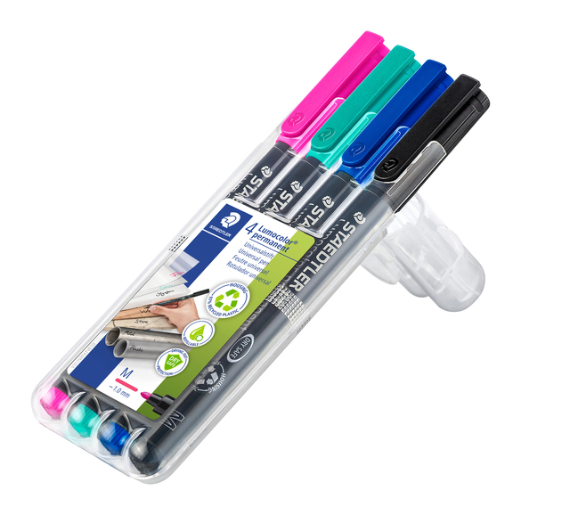 * Lumocolor permanent universele pen M 317. * Voor gebruik op nagenoeg alle oppervlakken, geschikt voor OHP. * Ook geschikt om op CD's en DVD's te schrijven. * Excellente veegvastheid en waterbestendigheid op nagenoeg alle oppervlakken. * Droog na luttele seconden, daarom ook ideaal voor linkshandigen. * Permanente, nagenoeg geurloze inkt. * DRY SAFE - kan dagenlang open liggen zonder uitdrogen (test ISO 554). * Zonder xyleen en tolueen. * Lijnbreedte M, medium (ca. 1,0 mm). * Navulbaar. * Opstelbare box met 4 kleuren. * Zwart is licht- en weersbestendig. * Behuizing gemaakt van 97% gerecycleerd plastic (lichaam, dop en eindkap).