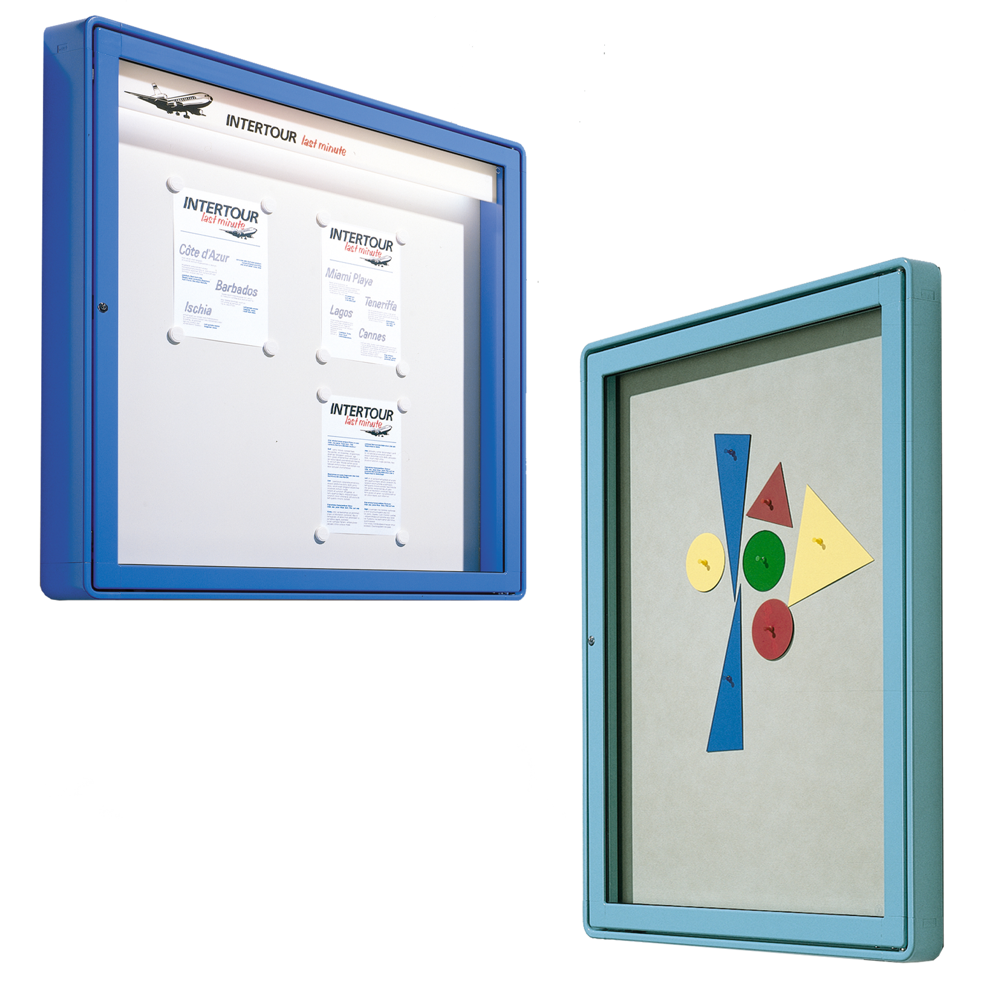 Wilt u informatie of podiumkunstprojecten bijvoegen? Geen probleem. Met de buitenvitrine, die voorzien is van een draaideur, kun je je creativiteit de vrije loop laten. De vitrine is voor wandmontage en het scharnier van de deur kan gekozen worden. Het aluminium frame is aan alle zijden afgerond, voorzien van schroefloze hoek- en steekverbindingen en de kleur is zelf te kiezen uit ons assortiment. De deur is gemonteerd met gasdrukdempers en verdekte bevestigingsmiddelen, waardoor hij gemakkelijk te verplaatsen is. Het glas van de deur bestaat uit 6 mm dik enkel veiligheidsglas en is afsluitbaar met een veiligheidscilinderslot. De achterwand van de vitrine is naar keuze gemaakt van leerstructuur, staal of geëmailleerd staal. Het achterpaneel van staal en geëmailleerd staal is beschrijfbaar met whiteboardstiften en droog uitwisbaar, en het achterpaneel met de lederen structuur kan worden vastgespeld. Voor de benodigde accessoires kunt u gerust rondkijken in ons assortiment. Deze vitrinekast kan op aanvraag worden gemonteerd.