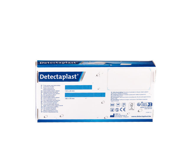 * HACCP pleisters zijn verplicht op alle plaatsen waar met voedselmiddelen wordt gewerkt zoals in voedingsbedrijven, horeca, grootkeukens, bakkers, beenhouwers, broodjeszaken etc. * Door zijn blauwe kleur valt de detecteerbare pleister op waardoor er minder kans is dat ze in de voedselketen terechtkomen. * Daarenboven is er een aluminium strip onder het wondpad waardoor de pleister in de voedingsindustrie gedetecteerd wordt door metaaldetectoren. * Deze pleisters zijn gemaakt uit waterdicht en vuilafstotend PE (poly-ethylen) materiaal. * Ze hebben een bijzonder goede kleefkracht waardoor ze zelfs in ruwe omstandigheden goed blijven zitten. * De hypo-allergene lijm zorg ervoor dat de kans op allergiën minimaal is.