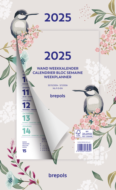 * Brepols Wand-week kalender 2025 - weekoverzicht 19 x 31 cm - Fantasy Assortiment Handig weekoverzicht. De Wand-week kalender heeft een indeling van 1 week per pagina. Hierdoor zie je in één oogopslag de afspraken en taken voor de hele week. Deze handige kalender zonder uurindeling laat je toe om vrij je planning per dag te bepalen. Zaterdag en zondag hebben evenveel schrijfruimte als de andere dagen. Voor zowel zakelijk gebruik als privédoeleinden. De Kalender heeft een jaaroverzicht achteraan en een overzicht van de schoolvakanties BE/NL op het rugschild. * Kenmerken: 12 maanden van januari tem december - 1 week per pagina - doordachte en functionele lay-out, voor een overzichtelijke planning, jaaroverzicht achteraan en overzicht schoolvakanties BE/NL op het rugschild - 4-talig NL-F-GB-D - met weeknummering - 112 pagina’s - inclusief internationale feestdagen - wit FSC agendapapier,  vlot beschrijfbaar - 19 x 31 cm - assortiment van 5 leuke fantasie tekeningen. Deze worden in willekeur uitgeleverd.