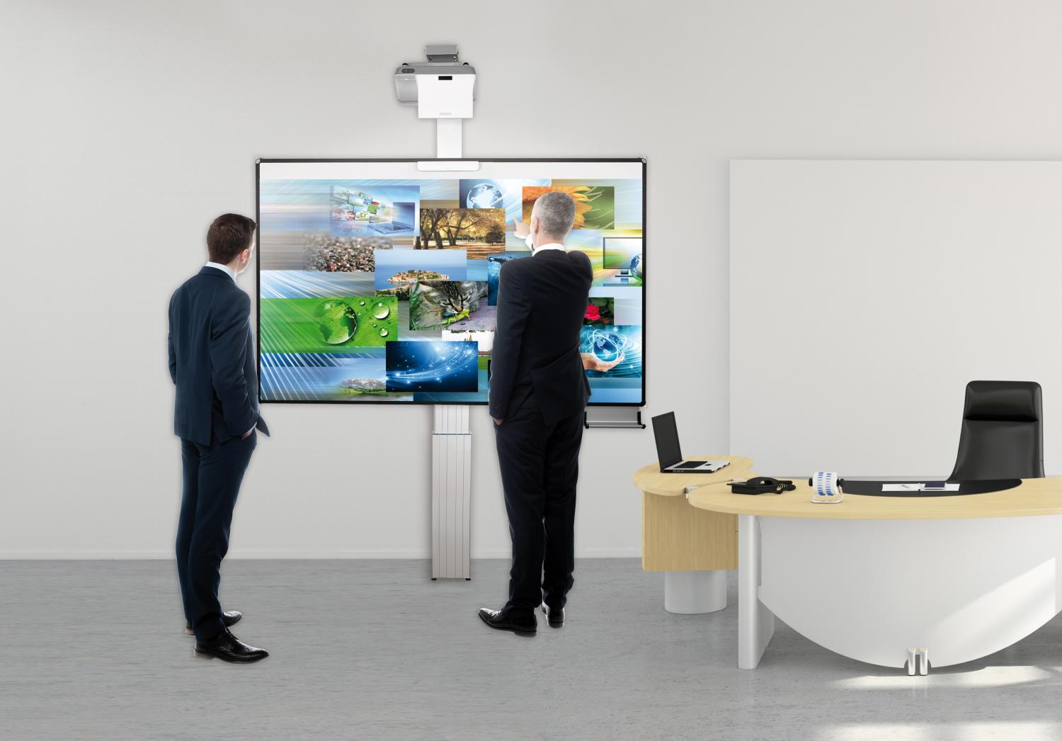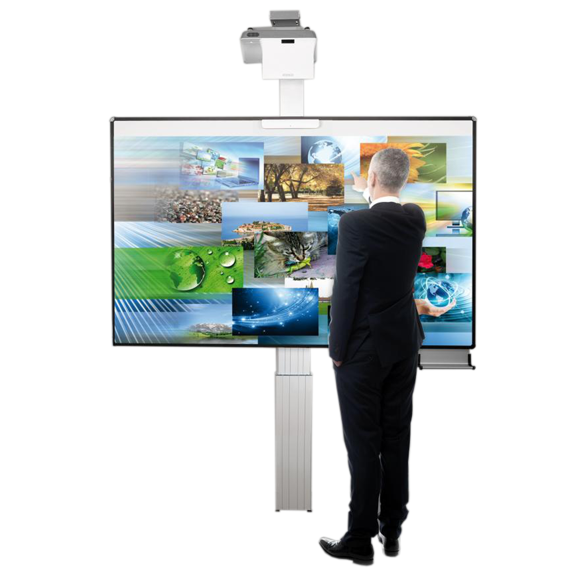 Elektrisch in hoogte verstelbare interactieve bordsystemen Onze elektrisch in hoogte verstelbare whiteboard deluxe 130 borden zijn ontworpen voor montage op massieve wanden. De verstelbare middenkolom bestaat uit een telescopisch aluminium profiel, waarin de motor is weggewerkt. Voordeel van de elektrische hoogteverstelling: Verlenging van de levensduur van de projectorlamp en de projector, omdat gecontroleerde beweging dure technologie beschermt. Met behulp van twee knoppen die aan het systeem zijn bevestigd, kan het whiteboard elektrisch op de juiste hoogte voor elke gebruiker worden ingesteld. Het projectiedoek is mat wit, beschrijfbaar met whiteboard markers en droog uitwisbaar. Bovendien is het middelste oppervlak van het whiteboard magnetisch. Het zwart geanodiseerde frame zorgt voor een goed contrast en heeft veiligheidshoekkappen. De extra brede aluminium design projectorarm zorgt voor maximale stabiliteit. Verborgen en opgeruimde kabelgeleiding in de projectorarm betekent dat er geen kabels langs het whiteboard hangen.