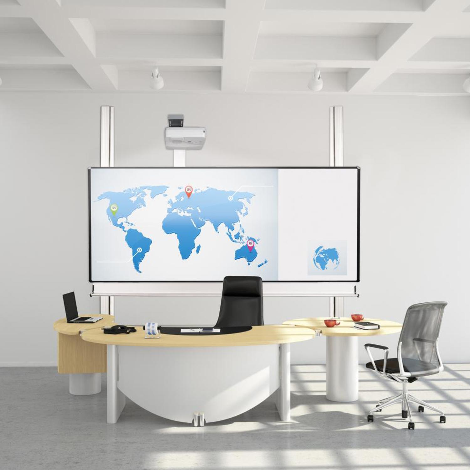 Handmatig in hoogte verstelbare interactieve bordsystemen Onze handmatig in hoogte verstelbare whiteboard deluxe 130 borden worden aan de muur bevestigd. Dankzij de contragewichten kan de hoogte van het whiteboard eenvoudig worden aangepast. De hoogteverstelling bestaat uit 2 aluminium profielen, die standaard geleverd worden met een hoogte van 2,60 m. Het projectiedoek is mat wit, beschrijfbaar met whiteboard markers en droog uitwisbaar. Het is geschikt voor gebruik met ultra short throw projectoren. Bovendien is het middelste oppervlak van het whiteboard magnetisch. Het zwart geanodiseerde frame zorgt voor een goed contrast en heeft veiligheidshoekkappen. Dankzij de bordbreedte van 3,00 meter is er voldoende ruimte voor notities, posters en notities. De projectie kan naar rechts of links worden uitgelijnd. Geef dit dan aan bij de bestelling. De extra brede aluminium design projectorarm zorgt voor maximale stabiliteit. Verborgen en opgeruimde kabelgeleiding in de projectorarm betekent dat er geen kabels langs het whiteboard hangen.