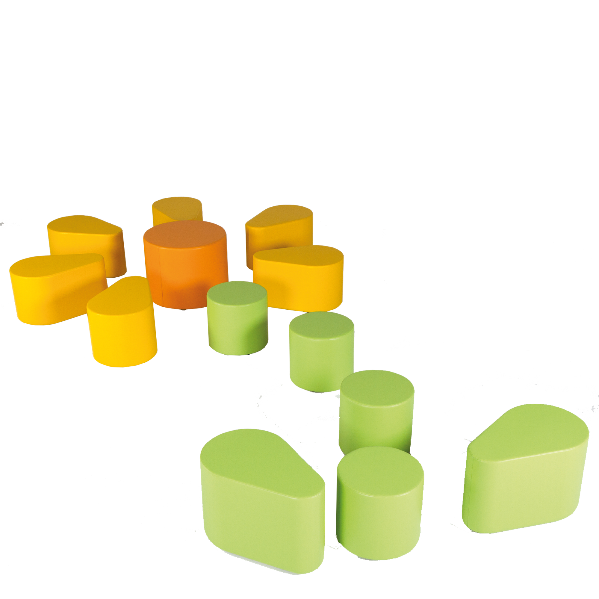 Bloemrijk vooruitzicht De zitgroep bestaat uit in totaal 13 losse onderdelen uit de series EGG en Spot. Samen gerangschikt vormen ze een bloem. De hoes is gemaakt van imitatieleer en is daardoor makkelijk wasbaar. Een houten plaat met kunststof vloerglijders dient als basis. De set bestaat uit: 6 x EGG krukken in geel, hoogte 35 cm 4 x SPOT krukken in limoengroen, hoogte 35 cm 2 x EGG krukken in limoengroen, hoogte 45 cm 1 x SPOT XL kruk in oranje, hoogte 40 cm De kleuren worden geleverd zoals afgebeeld.